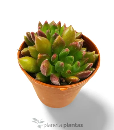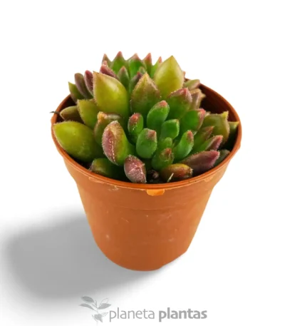 5,50 €Echeveria harmsii Ruby Slippers es una variedad llamativa de Echeveria, reconocida por el intenso color rojo que adquieren sus hojas bajo la exposición al sol. Esta suculenta forma rosetas compactas de hojas triangulares y carnosas, que pueden llegar a medir hasta 15 cm de altura y 20 cm de diámetro en condiciones óptimas de crecimiento. Sus tallos florales, que emergen en primavera, presentan pequeñas flores en forma de campana de tonos amarillos o anaranjados, añadiendo un toque de delicadeza a su apariencia llamativa. Ideal para jardines de suculentas, macetas y arreglos de jardinería, esta variedad agrega un toque de color vibrante y elegante a cualquier entorno.